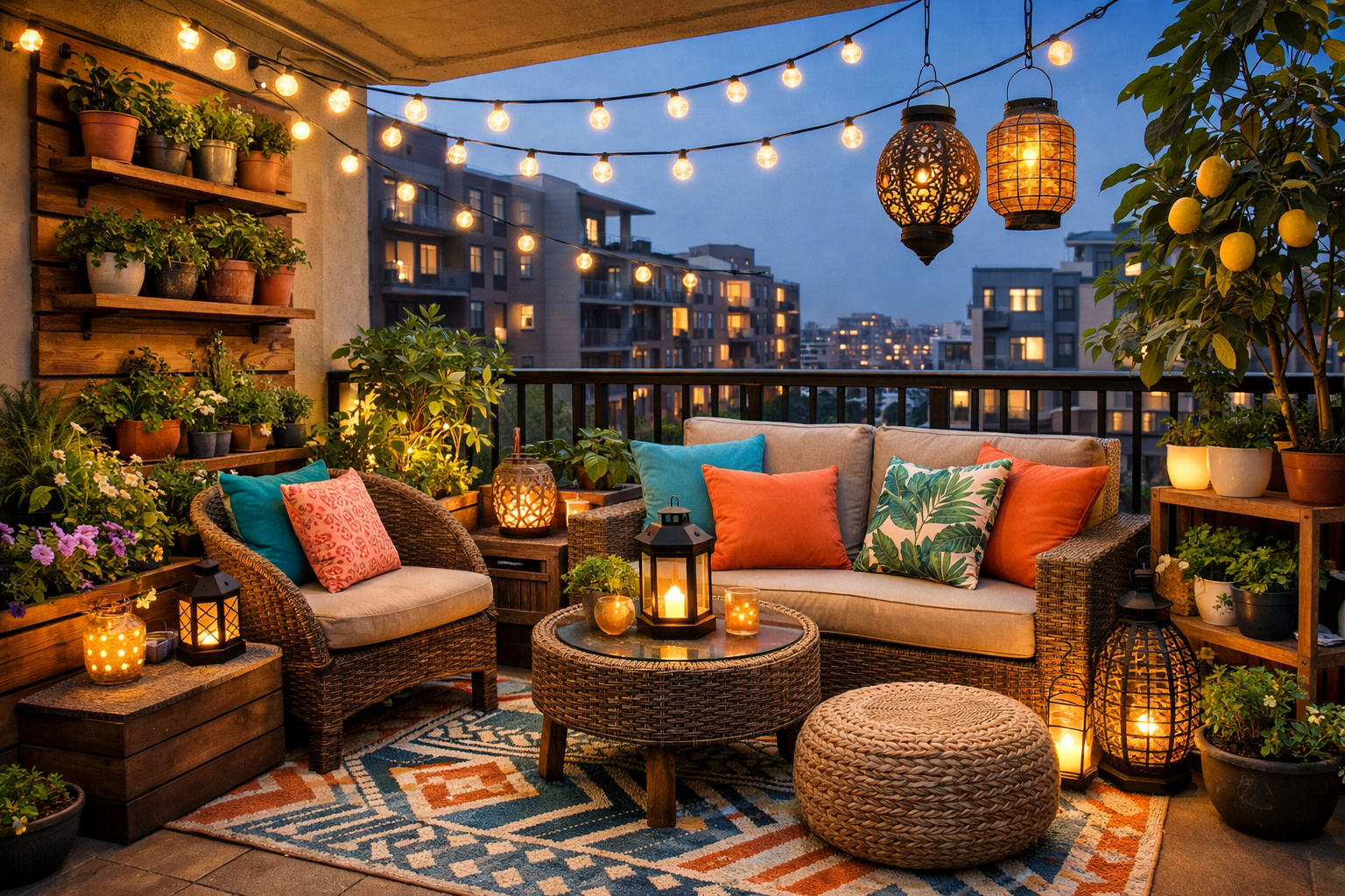 Quick Example: For a minimalist modern look, use sleek black metal planters with geometric designs, fill them with structural succulents and small grasses, and add a single, low-profile outdoor chair with a concrete side table. Illuminate with subtle LED strip lighting under the railing. For a more bohemian vibe, combine terracotta pots, colorful glazed ceramics, abundant trailing plants, a patterned outdoor rug, and scattered floor cushions with warm string lights.