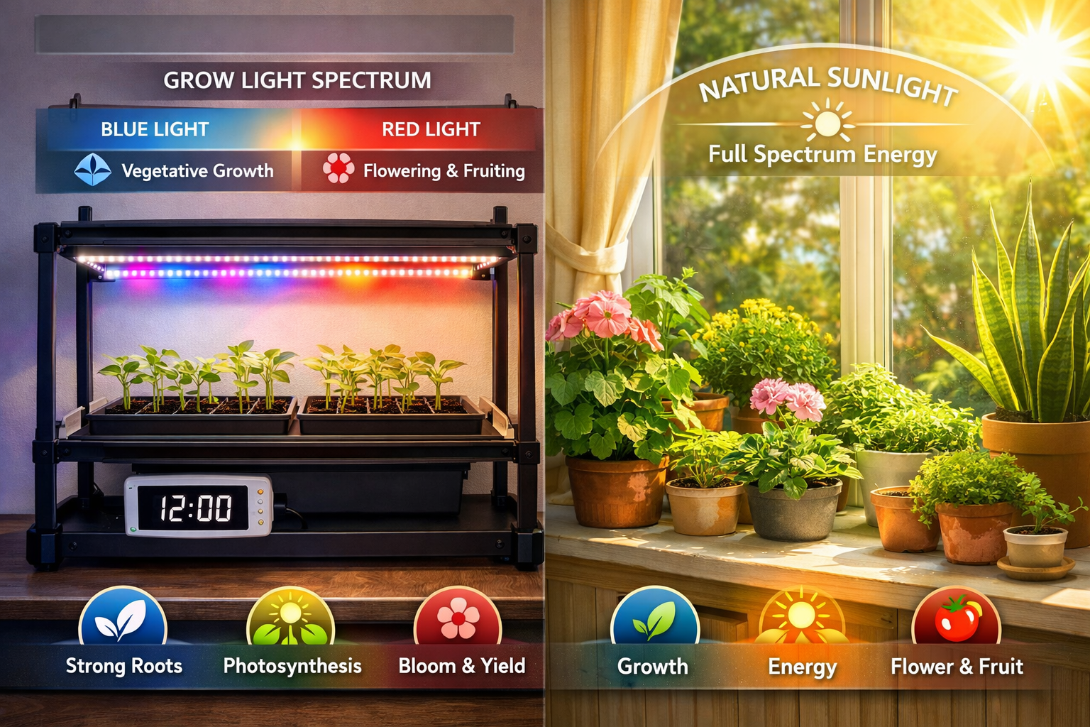• Timing: Use a timer to ensure plants receive 12-16 hours of light per day, mimicking a natural growing cycle. Plants also need a period of darkness to rest and perform other metabolic processes.